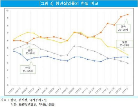 [아시아경제 정동훈 기자] 지속적으로 증가하는 국내 청년 실업률을 해소하기 위해 중소기업 중심의 경제 성장 전략이 필요하다는 주장이 나왔다. 8일 중소기업연구원 백필규 수석연구위원은 '일본의 청년고용, 한국의 미래인가? -중소기업 관점에서 청년고용 문제 해결을 위한 과제'라는 연구 결과를 발표했다. 보고서는 한국과 일본의 청년고용의 현황을 비교하고 중소기업 관점에서 청년고용 문제 해결을 위한 과제를 제시했다.보고서에 따르면 한국의 청년고용은 일본과 비교해 실업률, 경제활동참가율, 고용률 등 모든 지표에서 부진한 상황에 놓여 있다. 한국의 청년(15~29세) 실업률은 2008년 7.1% 수준에서 2017년 9.8% 수준으로 크게 높아진 반면, 일본의 청년(15~29세)실업률은 2003년 8.5%를 최고로 2017년 4.4%로 하락했다. 또 한국의 청년 경제활동참가율은 2017년 46.7%로 일본의 59.4%에 비해 12%포인트 이상 낮은 수준이다. 한국의 청년 고용률은 2017년 42.1%로 일본의 56.8%에 비해 14%포인트 이상 낮은 수준이다. 한국에 특수한 병역문제 등을 고려해 25~29세 청년층만을 비교해도 한국의 청년고용은 일본에 비해 상당히 부진한 상황이다.백 연구위원은 "한국과 일본의 청년 실업률 차이는 청년인구의 감소라는 인구구조적 요인 뿐만 아니라 대학진학률, 노동시장 미스매치(공급요인), 경제성장률, 산업특성, 노동시장 유연성(수요요인) 등 복합적 요인에 의해 생긴 것"이라며 "향후 청년인구의 감소로 총량적으로는 청년실업 문제가 개선될 가능성이 있지만, 다른 요인들의 해결없이는 문제가 그대로 상존할 가능성이 있다"고 진단했다. 이어 "청년고용의 개선을 위해서는 노동공급과 노동수요 측면의 복합적 영향요인을 직시하고 그 개선을 위한 전방위적 노력이 필요하다"고 밝혔다.백 연구위원은 "청년세대를 공무원이 아닌 창업선도세대로 육성하되, 창업실패의 부담을 최소화하기 위한 사회적 안전망 확보, 창업성공확률을 높이기 위해 '오상식·장그래 협업창업'이나 '1가족 1법인'과 같은 청장년 협업창업 및 중소기업 경력형 창업 지원 대폭 강화등의 방안을 검토할 필요가 있다"고 밝혔다. 또한 청년 경제활동참가율 제고를 위해서는 공무원 시험 대비 등 취업준비의 기대수익률이 중소기업 취업이나 창업의 기대수익률에 비해 훨씬 낮아지도록 유대해야 한다고 주장했다. 이를 위해 중소기업 취업이나 창업경험을 가진 사람들이 공공기관에 취업할 수 있는 확률이 높아질 수 있도록 공공기관 채용시스템을 전면 개편해야 한다고 밝혔다. 더불어 기업의 채용관행도 스펙보다는 취업이나 창업경험 등 경제활동참가를 촉진시키는 방향으로 전환될 수 있도록 사회적 합의를 만들어갈 필요가 있다고 주장했다.백 연구위원은 "노동시장 미스매치 개선을 위해서는 채용보조금보다는 중소기업의 낮은 임금수준을 보완할 수 있는 생애보상제도 도입 집중지원, 중소기업이 필요로 하는 고졸 인력과 노동시장에 공급되는 고학력 청년인력과의 괴리를 줄이기 위해 선취업?후진학 시스템 대폭 강화, 정책지원과 연동한 중소기업의 정보공개 노력 촉진등이 필요하다"며 "낙수효과는 사라지고 빨대효과가 커지는 대기업 중심 성장전략에서, 준비된 창업과 중소기업의 스케일업을 통해 분수효과를 크게 하는 중소기업 중심의 '고용있는 성장전략'으로 전환할 필요가 있다"고 밝혔다.정동훈 기자 hoon2@asiae.co.kr<ⓒ세계를 보는 창 경제를 보는 눈, 아시아경제(www.asiae.co.kr) 무단전재 배포금지>