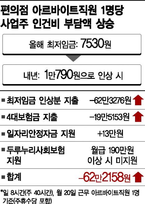 [아시아경제 심나영 기자] # 경기도 수원에서 편의점을 운영하는 가맹점주 이리도씨(가명ㆍ39세)는 가게를 보는 와중에도 스마트폰으로 최저임금 관련 뉴스를 검색하는 게 일이다. 이 씨는 "지금보다 최저임금이 더 오르면 차라리 내가 다른 편의점 아르바이트 뛰는 게 수입이 낫겠다"며 "정부는 아르바이트보다 못한 시급을 받는 영세자영업자와 중소기업을 똑같이 여기는 게 문제"라고 성토했다. 14일 내년도 최저임금 인상안 결정을 앞두고 편의점주들은 단체 휴업도 불사하겠다고 말했다.내년 최저임금이 노동계가 요구하는 1만원 인상 관철시, 편의점주의 1인당 인건비 부담이 62만원 이상 더 늘어나는 것으로 나타났다.13일 A편의점 본사측의 분석에 따르면 최저임금이 1만790원까지 오르게 되면, 편의점주가 아르바이트 1명(주40시간, 월 20일 근무 기준 고용, 주휴수당 포함) 고용을 유지할 때 투입되는 내년도 추가 비용을 분석한 결과 총 62만2158원의 비용이 더 들어가는 것으로 나타났다. 아르바이트생의 월급만 206만2928원에 달한다. 최저임금 인상으로 올해(7530원 기준)보다 월급이 62만3276원 더 오르게 되는 셈이다. 4대 보험금 지출 증가분은 5만8962원에 이른다.더욱 곤란해진 점은 최저임금 1만790원으로 인상 시 정부의 지원금이 더 줄어든다는 것. 일자리 안정자금 지원제도가 유지만 된다면 올해와 똑같이 사업주들이 13만원씩(올해 기준) 지원받을 수 있다. 그러나 올해까지 받았던 두루누리 사회보험 지원금(6만69920원)은 월급여 190만원 이상 직원에겐 정부가 지원을 해주지 않아 사업주들의 부담이 더 커진다. 올해보다 총급여와 4대보험 부담 금액은 크게 늘어나고, 정부 지원은 적게 받게 돼 한달에 총 62만2158원씩을 사업자가 더 지출해야한다.이미 인건비 부담 때문에 24시간 운영하는 편의점은 줄어들고 있다. 24시간 운영 여부를 점주가 자율적으로 선택 할수 있는 이마트24는 올해 상반기 신규점 출점 매장 중 9.7%만 24시간 영업을 선택했다. 지난해의 경우 신규점 출점 매장 117개 중 19%가 24시간 영업을 했다. 이마트 24 관계자는 "올해부터 최저임금이 급격히 인상되면서 야간 운영에 부담을 느낀 경영주들이 늘어난데 따른 것"이라고 분석했다. 가맹사업법도 24시간 운영을 더 쉽게 중단할 수 있도록 지난 4월 개정돼, 올해 하반기엔 24시간 영업 매장이 더욱 줄어들 것으로 보고 있다. 과거엔 직전 6개월 동안 밤 12시부터 새벽 6시까지 영업 비용이 이익보다 높으면 심야 영업 중단을 본부에 신청 할 수 있었다. 그러나 법 개정 후 현재는 직전 3개월 동안만 적자를 내도 본부에 신청 가능하다.올해 상반기 편의점 '순증수(출점수-폐점수)'도 작년 상반기에 비해 3분의 1토막 났다. 942개 점포였던 CU는 394개로, GS25는 1048개에서 343개, 세븐일레븐은 346개에서 245개로 추락했다. 순증수가 이처럼 떨어진 이유는 신규 출점 숫자가 줄어들었기 때문이다. 최저임금 인상 이후 영업여건이 어려워지며 자영업자는 물론 본사도 신규 점포를 선뜻 내기가 쉽지 않아졌다. 편의점 업계 관계자는 "우리가 '전국 편의점 동시휴업'을 내걸면서까지 싸우는 것은 최저임금 인상이 그만큼 답답하고 두렵다는 의미"라며 "14일 발표되는 최저임금 인상분에 따라 소상공인 자영업자의 생존권이 결정된다"고 호소했다.심나영 기자 sny@asiae.co.kr<ⓒ세계를 보는 창 경제를 보는 눈, 아시아경제(www.asiae.co.kr) 무단전재 배포금지>