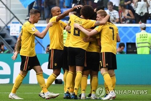 벨기에 축구대표팀 선수들이 잉글랜드와의 3-4위 결정전에서 전반 4분 토마 뫼니에가 골을 넣은 뒤 기뻐하고 있다. [이미지출처=연합뉴스]