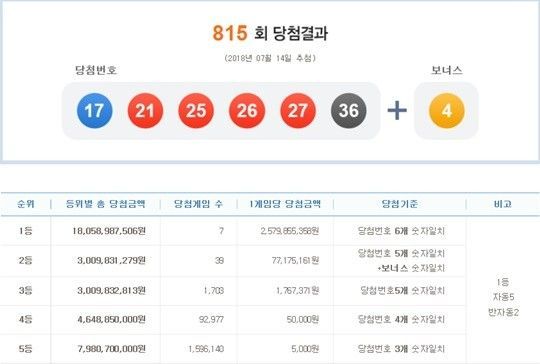 [아시아경제 구채은 기자] 나눔로또는 제815회 로또복권 당첨번호를 공개됐다. 이번 주 나눔로또 1등 당첨금은 25억7900만원으로 7명이 받게 된다.1등 당첨번호는 '17, 21, 25, 26, 27, 36'으로 6개 번호다.2등 보너스 번호는 '4'로 당첨번호 5개와 보너스 번호가 일치한 2등은 39명이다. 이들의 담청금액은 각각 7718만원씩이다. 당첨번호 5개를 맞힌 3등은 1703명으로 177만원씩을 수령한다.4개를 맞힌 4등(고정 당첨금 5만원)은 9만2977명, 당첨번호 3개가 일치한 5등(고정 당첨금 500원)은 159만6140명이다.815회 로또 1등 당첨자 7명 중 자동 당첨자는 5명으로 나머지 2명은 반자동 당첨자로 집계됐다.구채은 기자 faktum@asiae.co.kr<ⓒ세계를 보는 창 경제를 보는 눈, 아시아경제(www.asiae.co.kr) 무단전재 배포금지>