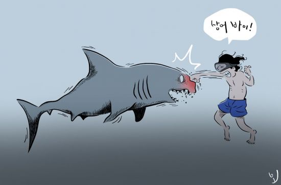최근 동해안에서 백상아리가 발견되며 인근 해수욕장의 피서객에 각별한 주의가 요망되고 있다. 일러스트 = 오성수 작가