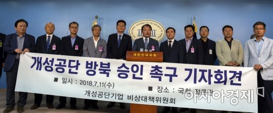 신한용 개성공단기업 비대위원장 등 개성공단 입주기업 대표들이 지난 11일 국회에서 '정부의 개성공단 방북 승인을 촉구'하는 기자회견을 갖고 있다./윤동주 기자 doso7@