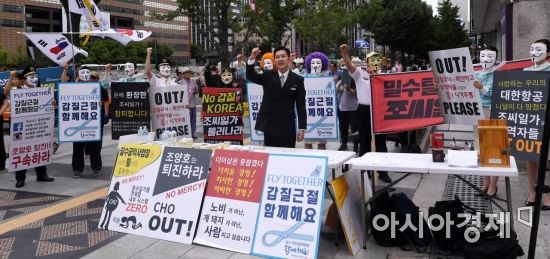 아시아나항공 직원들이 8일 서울 종로구 세종문화회관 앞에서 2차 집회를 열고 경영진 교체와 기내식 정상화를 촉구하고 있다. 이들은 "기내식 대란은 예견된 사태였다"며 "승객과 직원에게 모든 부담을 전가하는 경영진을 교체하고 기내식 서비스를 정상화해야 한다"고 주장했다./김현민 기자 kimhyun81@