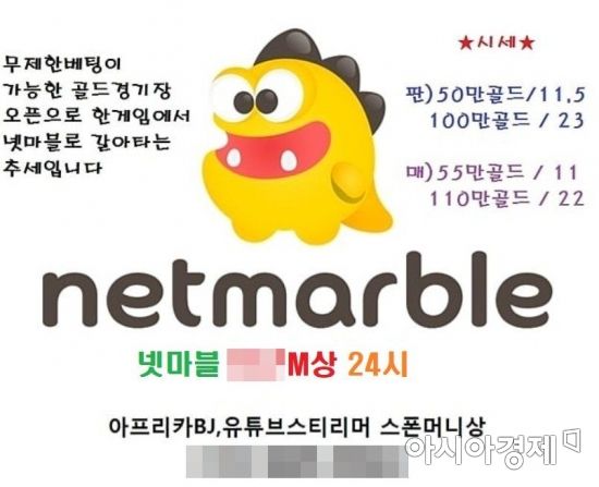 넷마블 바둑이 게임 100만골드당 현금 23만 원에 거래…현행 게임산업진흥에 관한 법률상 불법