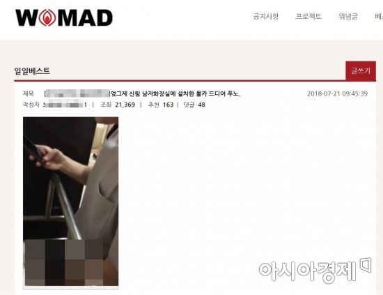 [아시아경제 유병돈 기자, 송승윤 기자] 남성 혐오 커뮤니티인 ‘워마드(WOMAD)’에 서울 신림의 한 남자화장실에서 찍은 것으로 추정되는 몰래카메라 촬영 사진이 올라와 논란을 낳고 있다.경찰에 따르면 지난 21일 오전 9시45분께 워마드에 ‘엊그제 신림 남자화장실에 설치한 몰카 드디어 푸노’라는 제목의 게시물이 올라왔다.게시물에는 남자화장실로 보이는 곳에 남성들이 용변을 보는 모습 등 9장의 사진이 담겨 있다.게시자는 “찍힌 한남(한국 남성들을 비하하는 단어)들은 많은데 구도가 안 좋아서 다른 화장실로 바꿔 달아봤노”라는 내용과 함께 남성들이 소변을 보는 모습을 찍은 7장의 사진을 게재했다.또 교복을 입은 남학생이 좌변기에 앉아 용변을 보는 모습이 담긴 2장의 사진과 함께 “아쉽게도 네임택이 잘 안 보이노”라는 글도 함께 올렸다.게시글에 올라온 댓글들 역시 사진이 찍힌 남성들을 조롱하는 내용으로 가득했다. 남성들의 외모를 비하하는 내용은 물론 죽여버리고 싶다는 등 자극적인 댓글들이 줄을 잇고 있다.한편 워마드에는 지난 19일에도 경기 수원의 한 남탕 탈의실에 몰카를 설치했다는 게시물이 올라왔다. 해당 게시물에는 한 남성이 알몸 상태로 탈의실 사물함 앞에 서 있는 모습이 담겼다.이 게시물을 올린 회원은 “다음에는 서울 신림 쪽에다가 (불법 카메라를) 하나 달아보겠다”며 대략적인 범죄 장소를 예고하기도 했다. 공중화장실 몰카를 올린 이와 동일인물인지 여부는 확인되지 않았다. 해당 게시물에 대해 수사에 착수한 경찰은 게시자를 추적하고 있다.<center><center><div class="slide_frame"><input type="hidden" id="slideIframeId" value="2018051416260360261A">