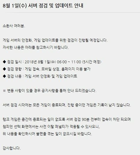 온라인 게임 리그오브레전드 측이 서버 안정화를 위해 점검을 진행한다.1일 리그오브레전드 제작사 라이엇게임즈 측은 ‘8월1일(수) 서버 점검 및 업데이트 안내’라는 공지문을 게시했다.공지에 따르면 이번 점검은 게임 서버의 안정화 및 게임 업데이트를 위해 진행되며 오전 6시부터 11시까지 총 5시간 동안 진행될 예정이다. 점검이 진행 중일 때는 게임 접속, 모바일 상점, 홈페이지 이용이 불가하다.또한 서버 점검 시각에는 모든 게임이 종료되며 진행 중이던 게임은 기록이 남지 않는다. 특히 랭크 게임은 게임이 중간에 종료되는 일이 없도록 서버 점검 90분 전부터 접속이 차단되고, 챔피언 선택 화면에서는 사전 이탈 페널티가 적용될 수 있다.서버 업데이트 내용에 따르면 이번 8.15 패치는 캐릭터 아칼리 리메이크, 수영장 파티 스킨 출시, 챔피언 밸런스 조정 등을 포함하고 있다.온라인이슈팀 issue@asiae.co.kr<ⓒ세계를 보는 창 경제를 보는 눈, 아시아경제(www.asiae.co.kr) 무단전재 배포금지>