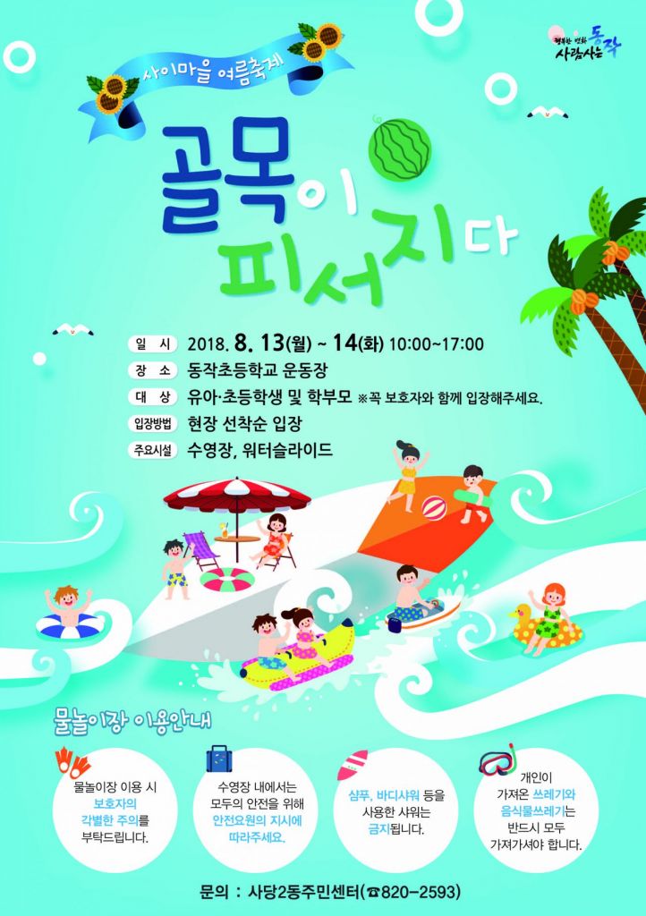 13,14일 이틀간 동작초등학교 운동장서 유아용?아동용 풀장, 워터슬라이드 등 물놀이시설, 푸드트럭 운영