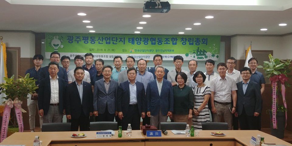광주평동산업단지 11개 입주기업이 참여하는 태양광협동조합 창립총회에 참석한 산업단지공단 직원과 입주업체 대표 등 관계자들이 기념촬영을 하고 있다.