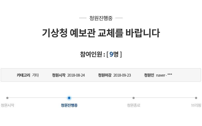 24일 청와대 국민청원 게시판에 올라온 기상청 예보관 교체 청원글. 태풍 솔릭이 기상청 예보와 달리 큰 피해없이 지나가면서 기상청의 과잉대응에 의한 휴교령으로 맞벌이 부부들이 곤란을 겪었다는 청원글이 쇄도했다.(사진= 청와대 국민청원 게시판)