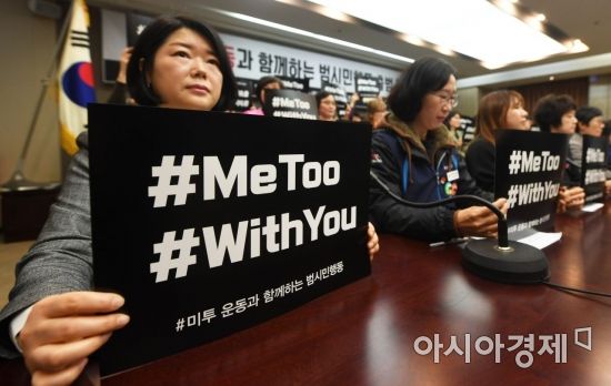 15일 서울 중구 프레스센터에서 열린 #미투 운동과 함께하는 범시민행동 출범 기자회견에서 참석자들이 미투 운동을 지지하는 피켓을 들고 있다. /문호남 기자 munonam@