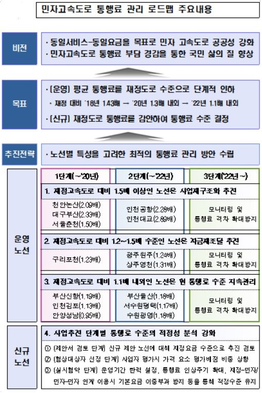 [아시아경제 박민규 기자] 정부가 민자고속도로 통행료를 2022년까지 재정고속도로와 비슷한 수준으로 인하하는 방안을 추진한다.국토교통부와 기획재정부는 공공성 강화를 위한 ‘민자고속도로 통행료 관리 로드맵’을 수립했다고 27일 밝혔다. 이에 따라 현재 재정고속도로 대비 1.43배 수준인 18개 민자고속도로 평균 통행료를 2020년 1.3배 수준으로 내린 뒤 2022년까지 1.1배 내외로 인하할 방침이다. 앞서 정부는 올 상반기 서울외곽고속도로와 서울춘천고속도로·수원광명고속도로 등 3개 노선의 통행료를 인하한 바 있다.이번 로드맵에서는 1단계로 재정고속도로와 통행료 격차가 큰 천안논산(2.09배)·대구부산(2.33배)·서울춘천(1.5배) 등 3개 노선에 대해 투자자 교체 및 운영기간 연장 등 사업구조 변경(사업 재구조화)을 통한 통행료 인하를 추진한다.통행료 격차가 상대적으로 작은 구리포천(1.23배)·부산신항(1.19배)·인천김포(1.13배)·안양성남(0.95배) 등 4개 노선은 자본구조 등을 변경해 발생하는 이익을 사업시행자와 주무관청이 공유하는 자금 재조달을 통해 통행료 인하 및 인상 억제를 추진한다.2단계로 인천공항(2.28배)·인천대교(2.89배) 2개 노선은 사업 재구조화 방식을 검토한다. 광주원주(1.24배)·상주영천(1.31배) 노선은 자금 재조달 방식을 적용한다. 교통량 추이와 금리 변동 및 재무상태 등을 고려해 민간사업자와 협의를 거쳐 순차적으로 2022년까지 평균 통행료를 재정고속도로의 1.1배 수준으로 인하할 계획이다.3단계는 1·2단계 통행료 인하 노선 및 이미 재정고속도로 수준인 노선이 물가인상 등으로 다시 통행료 격차가 확대되는 것을 방지하지 위해 통행료 인상 주기를 관리할 예정이다. 휴게소·태양광발전 등 부대사업 발굴과 추가 자금 재조달 및 재정 지원 등도 병행한다.신규 민자고속도로 노선은 추진단계별로 통행료의 적정성 분석을 강화해 재정고속도로 대비 최소 수준으로 유지하도록 할 계획이다. 사업자 선정 평가 시에도 낮은 통행료를 제시한 사업자를 우대한다.앞서 정부는 민자도로의 효율적인 관리·감독을 위해 한국교통연구원을 지난달 민자도로관리지원센터로 예비지정했다. 내년 1월부터 본격적인 운영에 들어갈 예정이다. 이를 통해 실시협약 체결과 운영평가 지원 및 유지·관리·운영 기준 제안, 미납 통행료 징수, 자금 재조달 여건 검토 등 관련 업무를 수행하게 된다.정부 관계자는 “이번 로드맵에 따른 후속 절차로 한국개발연구원·한국교통연구원 등 전문기관을 통한 심도 있는 검토와 민간사업자와의 충분한 협의를 통해 정부와 사업자 모두 수용할 수 있는 방안을 마련해 추진할 것”이라며 “민간투자사업심의위원회를 통해 로드맵 이행 상황을 주기적으로 점검·관리할 예정”이라고 말했다.박민규 기자 yushin@asiae.co.kr<ⓒ세계를 보는 창 경제를 보는 눈, 아시아경제(www.asiae.co.kr) 무단전재 배포금지>