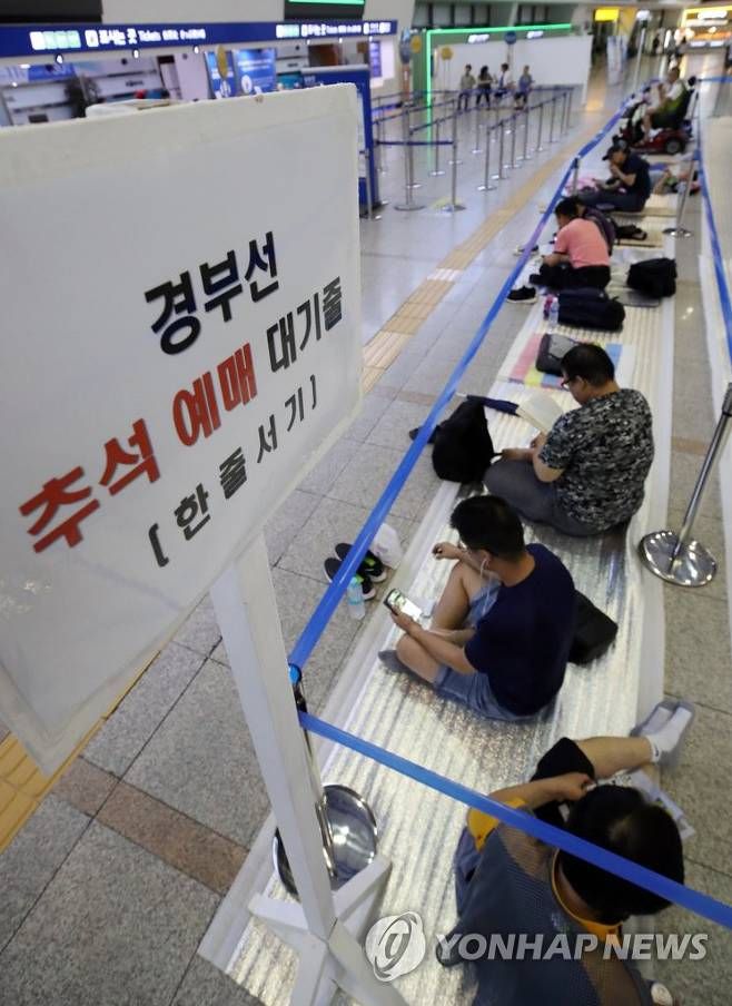 추석 열차표 예매를 하루 앞둔 27일 밤 서울역에서 고향으로 가는 승차권을 구입하려는 시민들이 길게 줄지어 대기하고 있다. 사진=연합뉴스