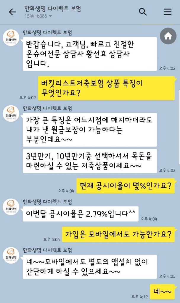 [아시아경제 박지환 기자] 한화생명은 다이렉트보험 전용채널인 온슈어에 채팅을 통해 보험관련 업무 상담을 도와주는 '라이브챗' 서비스를 도입했다고 28일 밝혔다.라이브챗은 카카오톡 또는 웹 채팅을 통한 상담 서비스이다. 고객은 PC 및 모바일 홈페이지에서 실시간 상담 탭을 클릭하고 보험상품, 가입상담, 계약 관리 등의 질문 유형을 선택 후 질문을 남기면 된다.상담시간인 9시부터 18시까지는 전문 상담원에게 직접 연결돼 관련 내용을 실시간 채팅을 통해 안내 받을 수 있다. 상담시간 이외에는 자주묻는질문(FAQ)에 대한 답변이 미리 등록돼 있어 쉽게 답변을 찾아 볼 수 있도록 했다. 박지환 기자 pjhyj@asiae.co.kr<ⓒ세계를 보는 창 경제를 보는 눈, 아시아경제(www.asiae.co.kr) 무단전재 배포금지>
