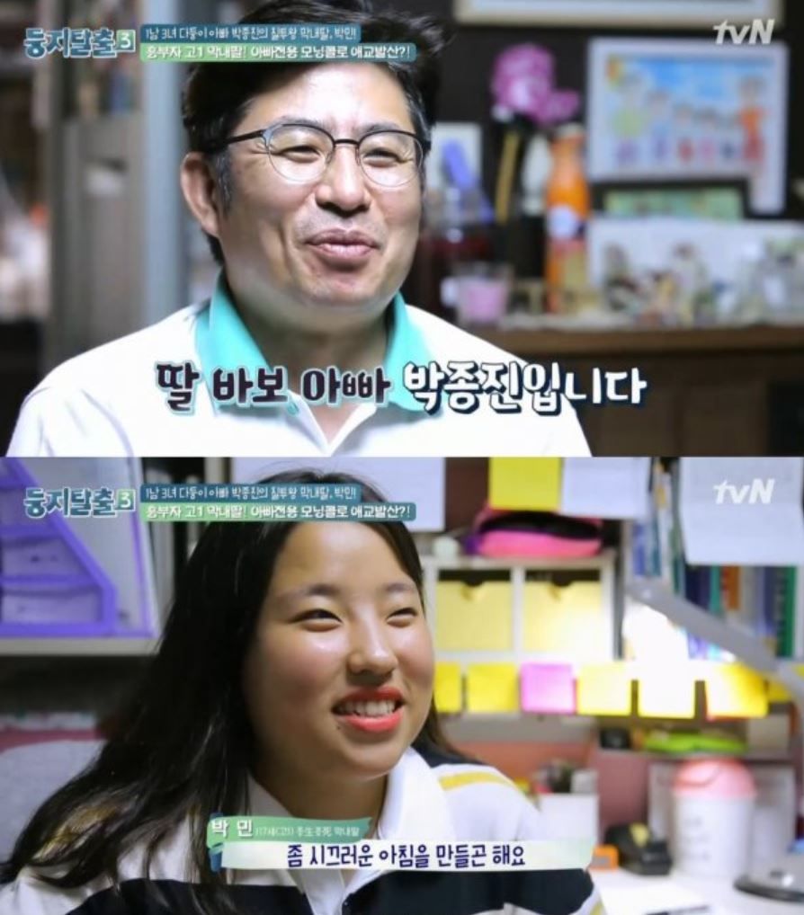 '둥지탈출3' 박종진 전 앵커가 막내딸에 대한 애정을 드러냈다.28일 방송된 tvN '둥지탈출3'에서는 새롭게 합류한 박종진 전 앵커 가족의 일상이 그려졌다.이날 방송에서 박 전 앵커는 자신을 "딸바보 아빠 박종진 전 앵커"라고 소개했다.이어 공개된 그의 막내딸 박민은 "제가 많이 나서는 걸 좋아해서 집에서도 많이 시끄러운 편이다. 아빠 엄마나 언니들한테는 꼭 노래를 부르면서 좀 시끄러운 아침을 만들곤 한다"며 아빠, 엄마에게 기상 전부터 노래를 불러줬다.이에 박 전 앵커는 일어나자마자 박민을 안으며 모닝뽀뽀를 하는 등 딸에 대한 각별한 애정을 드러냈다. '다른 딸에게는 어떻게 하냐'는 질문에 그는 "똑같다. 왜냐면 세 명이 서로 사랑을 받기 위해 경쟁을 한다"고 답했다.한편, tvN '둥지탈출3'는 연예인 자녀들이 부모의 품을 떠나 낯선 환경에서 홀로 생활하는 모습을 담아내는 관찰 프로그램이다.온라인이슈팀 issue@asiae.co.kr<ⓒ세계를 보는 창 경제를 보는 눈, 아시아경제(www.asiae.co.kr) 무단전재 배포금지>