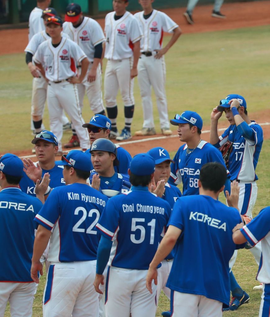 28일 오후 (현지시간) 인도네시아 자카르타 겔로라 붕 카르노(GBK) 야구장에서 열린 2018 자카르타-팔렘방 아시안게임 B조 예선 마지막 한국과 홍콩의 경기에서 21-3으로 승리한 한국 대표팀 선수들이 더그아웃으로 들어오며 승리를 자축하고 있다. / 사진=연합뉴스