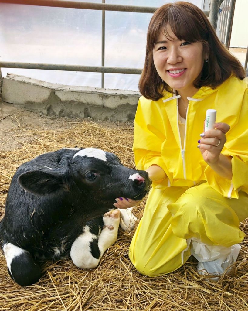 김희진 유라이크코리아 대표가 축우 생체관리 바이오 캡슐 '라이브케어'의 송아지 전용 제품을 선보이고 있다.