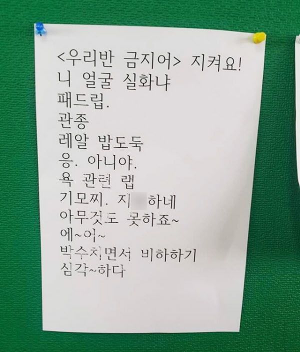 상황이 이렇다 보니 지난해 한 초등학교에서는 이런 패륜적인 글과 말을 하지 말자며 ‘우리 반 금지어’를 만들기도 했다. 한 커뮤니티에 공개된 사진을 보면 이 교실에서는 ‘사용하지 않아야 할 11가지 말’을 정해 친구들과 지키고 있다.금지된 말 주요 내용을 보면 △패드립: '패륜적 드립'의 줄임말로 부모나 조상에 대한 욕을 할 때, △니 얼굴 실화냐: 상대방의 외모를 비하할 때, △응 아니야: 상대의 말을 무시하고 싶을 때 등이 해서는 안 될 말에 꼽혔다.한편 방송통신심의위원회(방심위)는 앞서 5월 어린이·청소년에게 부정적 영향을 미치는 패륜적 욕설을 집중적으로 모니터링한 바 있다.방심위는 “최근 인터넷 공간에서 성기 또는 성행위 등을 빗대어 부모나 가족 등을 비하하는 욕설이 범람하고 청소년들 사이에서 ‘패륜놀이’, ‘패드립놀이’ 등이 급속도로 확산되고 있다”고 설명했다. 이어 “모방심리가 강한 어린이·청소년들은 경쟁적으로 더 심한 욕설을 하려는 경향이 있다"며 ”온라인 언어폭력에 그치는 것이 아니라 실제 가족·사제·교우관계의 파탄을 불러올 우려가 커 사회적 각성과 자정노력이 필요하다”고 강조했다한승곤 기자 hsg@asiae.co.kr<ⓒ세계를 보는 창 경제를 보는 눈, 아시아경제(www.asiae.co.kr) 무단전재 배포금지>