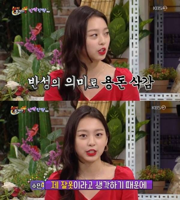 배우 이수민이 비속어 논란에 대해 사과했다.6일 방송된 KBS2 ‘해피투게더3’에는 배우 이수민, 방송인 김태진, 크리에이터 이사배, 도티 등이 게스트로 출연했다.이날 이수민은 최근 불거진 에 대해 “제 말의 무게에 대해서 생각하지 못하고 경솔하게 말실수를 했다. 많이 반성하고 있다”고 사과했다.지난 7월 이수민은 배구선수 임성진과 열애설에 휩싸였다. 당시 이수민 측은 보도를 부인했고 열애설은 일단락되는 듯했지만, 이수민이 개인 비속어를 사용한 사실이 밝혀져 논란이 일었다. 이후 이수민은 자필 사과문을 게재하고 사과했다.이수민은 “여러 일을 겪고 나서 용돈이 절반으로 깎였다. 제 스스로도 많이 받는 건 좀 아니라고 생각했다”며 “10시 이후엔 휴대폰도 압수다”라고 반성하고 있다고 강조했다.한편 이수민은 항공사 최연소 모델로 발탁된 것에 대해 “진짜 어려웠다. 웃는 게 그냥 웃는 게 아니라 눈은 크고 입은 웃고 있어야 하는데 각도도 친절하게 응대할 것 같은 포즈여야 했다”면서 “끝나고 집에 가니 덜덜덜 떨리더라”고 비하인드 스토리를 공개했다.온라인이슈팀 issue@asiae.co.kr<ⓒ세계를 보는 창 경제를 보는 눈, 아시아경제(www.asiae.co.kr) 무단전재 배포금지>