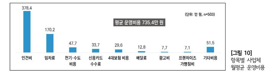 [아시아경제 정동훈 기자] 소상공인·자영업 사업체가 부담하는 인건비가 운영비의 절반이 넘는 것으로 나타났다.서울연구원이 최근 자영업 10개 업종 503개 사업체를 대상으로 설문조사 한 결과 이같이 나왔다고 밝혔다. 서울연구원 연구진은 봉제의복 제조업 61곳 등 제조업 2개 업종, 슈퍼마켓 30곳 등 소매업 2개 업종. 제과점업 51곳 등 음식점업 4개 업종, 보육시설운영업 50곳 등 기타 2개 업종을 대상으로 실태조사를 실시했다. 해당 업체 종사자는 1070명이었다. 업체당 평균 2.1명을 고용했다.소상공인 사업체는 월평균 735만4000원을 운영비용을 쓰고 있었다. 이중 인건비는 378만4000원으로 전체 비용의 51.5%를 차지했다. 다음으로 임차료 170만2000원(23.1%), 전기·수도비용 47만7000원 순으로 나타났다.업종별로 인건비 비중은 차이를 보였다. 봉제의복 제조업(69.3%)과 인쇄 및 인쇄관련 산업(69.1%)은 상대적으로 인건비 비중이 컸다. 반면, 슈퍼마켓(33%)과 체인화편의점(37.6%), 소매업과 제과점업(31.5%) 등은 인건비 지출 비중이 낮았다. 종사자 평균 급여는 시급기준 8888원이었다. 월급으로 환산하면 167만8000원 수준으로 주당 근무시간은 평균 40.9시간으로 나타났다. 종사자들은 대부분 최저임금을 적용 받고 있는 것으로 나타났다. 올해 월평균 매출액은 2530만2000원으로 나타났다. 조사대상 사업체의 57%(287개)가 지난해보다 매출액이 줄엇다고 답했다. 매출이 증가했다고 밝힌 업체는 5.6%(28개)에 불과했다. 매출이 줄어든 사업체의 지난해 대비 매출 감소 규모는 평균 19.6%로 나타났다.정동훈 기자 hoon2@asiae.co.kr<ⓒ세계를 보는 창 경제를 보는 눈, 아시아경제(www.asiae.co.kr) 무단전재 배포금지>