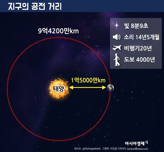 지구의 자전축이 23.5°가량 기울어져 있기 때문에 태양 광선은 북반구와 남반구에 동일한 각도로 비추지 않습니다. 태양 광선이 북반구를 직접적으로 비추는 7월경이 북반구는 여름이 됩니다. 반대로 태양 광선이 직접 비추지 않고 산란된 복사에너지를 받는 남반구는 겨울이 되는 것이지요. 반대로 1월경 태양 광선이 남반구를 직접 비추면 남반구는 여름이지만 북반구는 겨울이 되는 것입니다.태양의 남중고도는 봄과 가을은 52도, 여름은 75도, 겨울은 28도입니다. 지구의 자전축이 기울어지지 않고 수직이라면 봄·여름·가을·겨울 사계절 모두 태양의 남중고도는 52도입니다.지구는 이렇게 제자리에서 뱅글뱅글 돌면서도 크게는 태양의 주위를 돕니다. 지구가 제자리에서 도는 자전의 속도는 초속 465m의 눈 깜짝할 새였습니다. 그러면 멀리 태양의 주위를 도는 속도는 어떨까요?지구에서 태양까지 거리는 약 1억5000만㎞입니다. 지구의 공전궤도를 원이라고 보고, 원의 둘레를 구하는 공식 '2πr'에 대입하면 2x3.14x1억5000만㎞는 9억4200만㎞입니다. 1년 동안 지구가 태양을 도는 거리는 9억4200만㎞라는 것입니다.이 거리를 시간으로 환산하면, 시속 10만7534㎞라는 속도가 나옵니다. 초속으로는 29.9㎞, 약 30㎞의 상상을 초월하는 엄청난 속도가 도출되지요. 음속이 340m/s, 가장 빠른 총알의 속도가 약 1㎞/s 정도니까 총알보다 30배는 빠른 속도로 지구는 태양을 돌고 있는 것입니다.지구에서 태양까지는 빛이 초속 30만㎞씩 달려서 8분19초 만에 도달할 수 있는 거리이니 지금 우리가 보고 있는 태양은 항상 8분19초 전의, 과거의 태양이 되는 셈입니다. 소리로는 14년5개월 정도 걸리고, 비행기를 타면 20년을 넘게 날아가야 하며, 걸어서는 4000년을 걸어야만 도착할 수 있는 거리입니다.김종화 기자 justin@asiae.co.kr<ⓒ세계를 보는 창 경제를 보는 눈, 아시아경제(www.asiae.co.kr) 무단전재 배포금지>