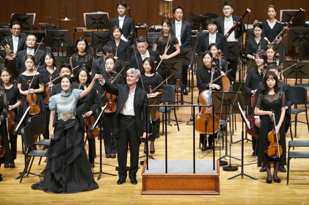 마시모 자네티(56)가 새 경기필하모닉오케스트라 상임지휘자로 첫 데뷔무대를 성공적으로 마쳤다. 지난 8일 서울 예술의전당 콘서트홀에서 진행된 취임연주회에서 소프라노 박혜상과 관객의 호응에 답하고 있는 모습. [사진=경기도문화의전당]