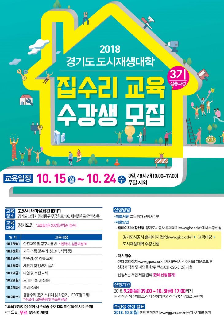 [아시아경제(수원)=이영규 기자] 경기도시공사가 집수리과정 수강생을 모집한다.경기도 도시재생지원센터는 도시재생대학 집수리과정 제3기 수강생을 오는 20일부터 다음 달 5일까지 모집한다고 17일 밝혔다.집수리 과정은 쇠퇴가 진행중인 지역의 주민들이 자력으로 노후건축물을 관리 및 개선능력을 배양하는 실습중심 교육이다.도시재생지원센터는 지난 상반기에 제1 및 2기 집수리과정 교육을 실시했다.이번 교육 과정은 ▲안전한 공구사용법 ▲가구 리폼 및 수리 ▲방충망, 창, 창틀 교체 ▲세면기 및 양변기 설치 ▲타일 및 수전교체 ▲도배 ▲전기스위치, LED조명 교체 등 생활밀착형 이론과 실습교육으로 구성된다.종전 교육 수강생 의견을 반영해 이번 집수리 교육 과정에는 타일 교체 및 도배 교육이 추가됐다.도 도시재생센터는 선착순 30명을 대상으로 다음 달 15일부터 24일까지 8일간 교육을 진행한다. 교육 장소는 고양시 새마을회관이며 교육비는 무료이다.수강 신청 등 자세한 내용은 경기도 도시재생지원센터 홈페이지(www.ggursc.or.kr)에서 확인할 수 있다.이영규 기자 fortune@asiae.co.kr<ⓒ세계를 보는 창 경제를 보는 눈, 아시아경제(www.asiae.co.kr) 무단전재 배포금지>