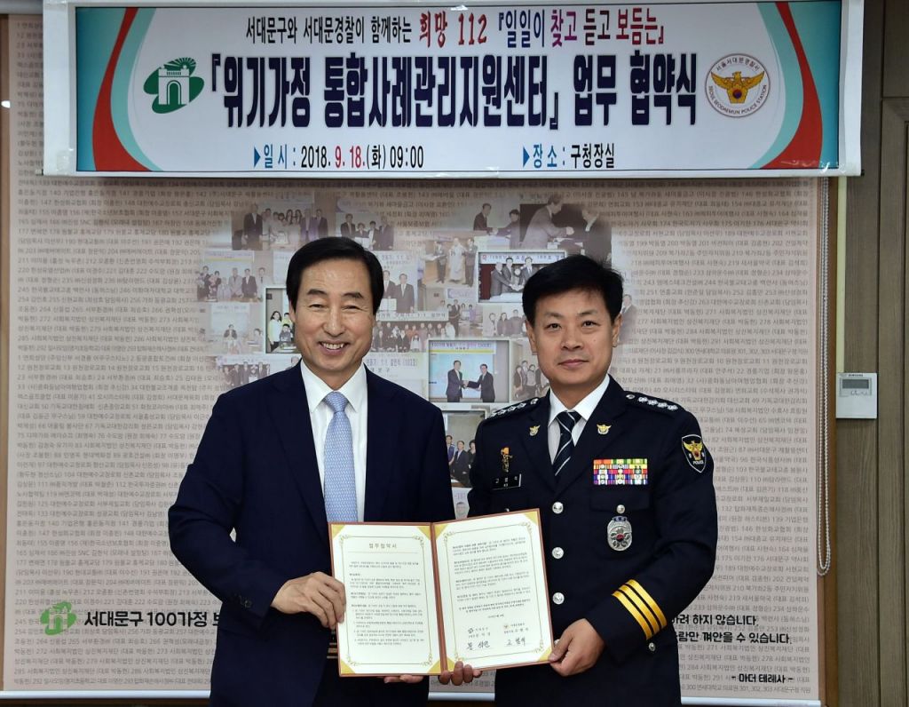 문석진 서대문구청장(왼쪽)과 고범석 서대문경찰서장이 ‘위기가정 통합사례관리 지원센터’ 업무 협약을 맺은 뒤 기념촬영을 하고 있다.