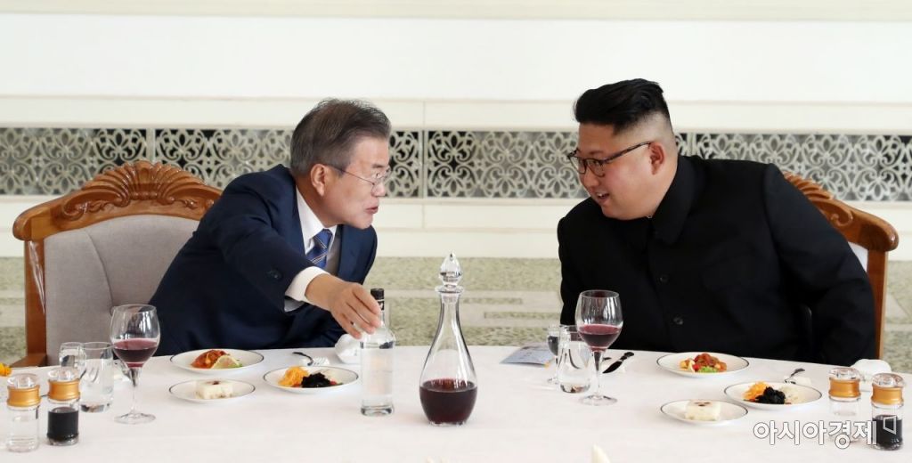 문재인 대통령이 19일 평양 옥류관을 방문해 김정은 국무위원장과 오찬을 하며 대화하고 있다. /평양사진공동취재단