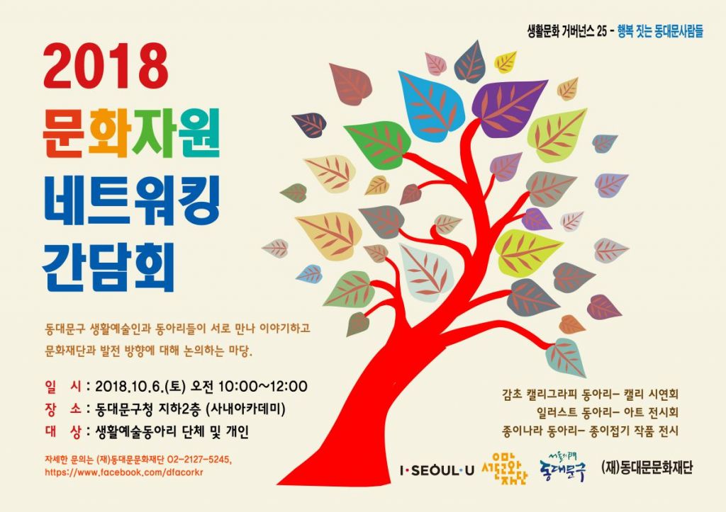 [아시아경제 박종일 기자] 동대문구(구청장 유덕열)가 문화예술도시로 자리매김할 수 있도록 앞장서고 있는 동대문문화재단(대표 구본호)이 ‘2018 문화자원 네트워킹 간담회’를 개최한다.이번 간담회는 10월 6일 오전 10시부터 12시까지 구청 지하 2층 사내아카데미에서 진행된다. 그간의 사업추진 과정에서 조사·발굴된 생활예술동아리와 예술인 등 40여 명이 한자리에 모여 우리 지역의 문화예술 발전방안을 논의하며 서로 간의 협력체계를 공고히 한다.아울러 이날 감초캘리동아리의 캘리그래피 시연회, 미술동아리의 아트 전시회, 종이나라동아리의 종이접기작품 전시회 등도 함께 진행될 예정이다.구본호 동대문문화재단 대표는 “이번 간담회를 통해 지역 문화주체들 간의 소통이 더욱 활성화되고 그를 바탕으로 동대문구가 문화예술이 가득한 도시로 거듭나기를 바란다”며 “앞으로도 지역의 문화플랫폼을 만들어 가는 데에 적극 노력하겠다”고 전했다.