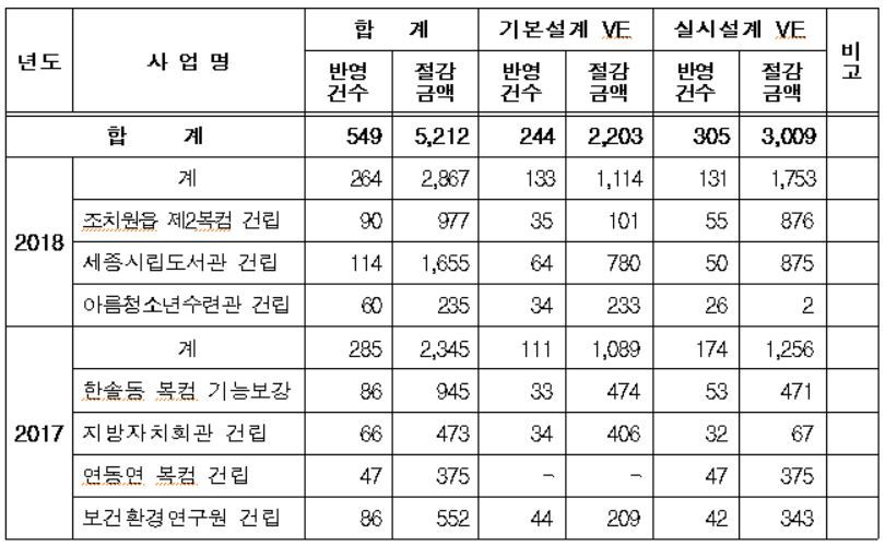 공공건축사업 설계VE 검토 결과자료(단위 : 건, 백만원). 세종시 제공