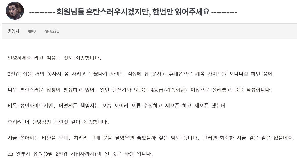 30일, 해킹을 당한 성인사이트 운영자가 데이터 베이스(DB)가 일부 유출된 것이 사실이라며 공지사항을 올렸다. (사진=홈페이지 캡처)