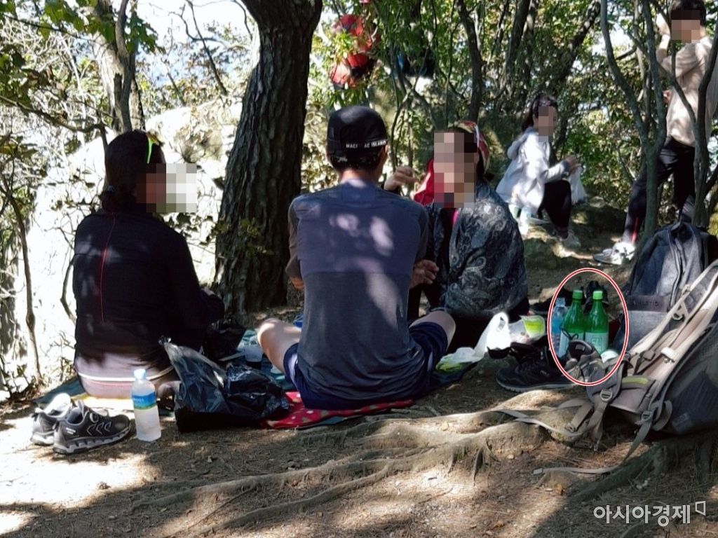 지난달 29일 오후 청계산 정상 부근에서 등산객들이 막걸리, 맥주 등을 마시고 있다.