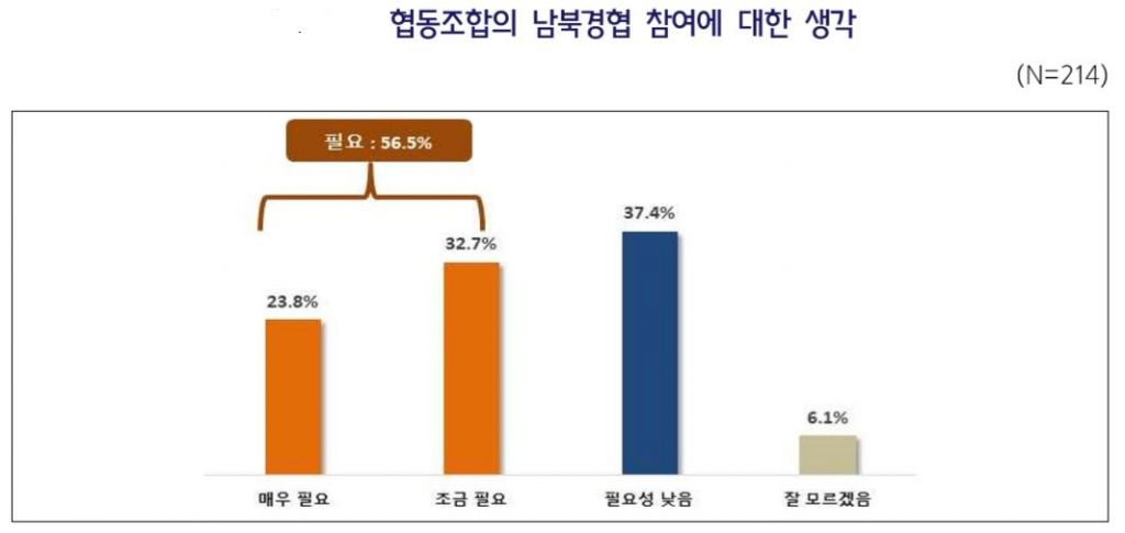 [아시아경제 김대섭 기자] 중소기업협동조합의 절반 이상은 남북경협에 대한 참여가 필요하다고 생각하는 것으로 나타났다. 진출희망 지역으로는 개성, 평양, 신의주 등 북한의 '서해 경제벨트'를 선호했다.4일 중소기업중앙회에 따르면 '중소기업협동조합의 남북경협 인식조사' 결과, 56.5%가 '필요하다'고 답했다. '필요성이 낮다'는 의견은 37.4%로 조사됐다. 연합회보다는 전국조합과 지방조합에서, 조합 규모(조합원 수ㆍ평균 매출액)가 클수록 협동조합의 남북경협 참여가 필요하다고 인식하는 비중이 더 높았다.이번 조사는 중소기업협동조합 214개를 대상으로 실시했다. 조합 회원사들 중 남북경협 참여 의사가 있는 비중이 어느 정도인지에 대한 질문에는 응답자의 60.7%가 '40% 미만'이라고 답해 가장 많은 비중을 차지했다.