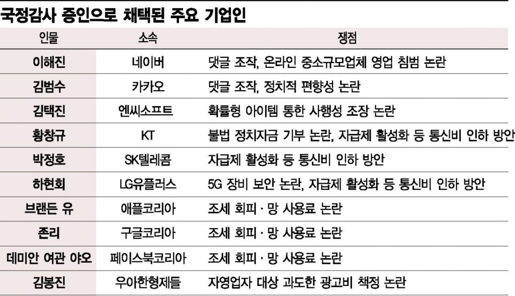 국감 증인 불려가는 IT 국내외 기업인 질의 온도차네이버·카카오 총수 뉴스·골목상권 침해 등으로 증인 채택역차별 논란 거센 구글 등 글로벌 기업은 회피성 답변으로 일관