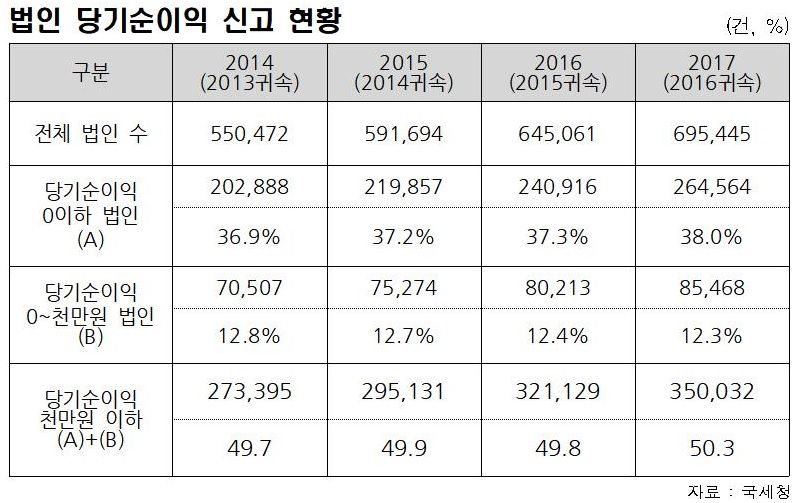 [아시아경제 이광호 기자]지난해 국내기업 10개 중 4개는 당기순이익이 0원 이하인 것으로 나타났다.7일 국회 산업통상자원중소벤처기업위원회 소속 자유한국당 김규환 의원이 국세청으로 제출받은 법인 당기순이익 신고현황 자료에 따르면 당기순이익이 '0원 이하'라고 신고한 법인은 2014년 20만2888개에서 2015년 21만9857개, 2016년 24만916개, 2017년 26만4564개로 증가하고 있다.전체 법인에서 차지하는 비율도 2014년 36.9%에서 2017년 38%로 증가 추세다.당기순이익이 0원 이하라는 것은 1년 동안 회사를 운영했지만 순 이득을 전혀 남기지 못했거나 오히려 손해를 봤다는 뜻이다. 1년 동안 이익은 냈지만, 천만원 이하의 순이익을 거둔 기업이 8만5468개 였다.이는 전체 법인의 절반이상인 35만개의 기업(50.3%)이 한 달 평균 100만원도 안 되는 이익을 냈거나 손해를 봤다는 의미다.또한 한국은행이 제출한 자료에 따르면 2017년 한계기업은 3112개로 외감기업 대비 13.7%의 기업이 벌어들인 영업이익으로 대출금 이자도 갚지 못하는 '좀비기업' 인 것으로 나타났다.전체 대기업 중 9.9%인 382개 기업이, 중소기업 중 14.4%인 2730개의 기업이 한계기업인 것이었다.이 중에서 5년 이상 연속 한계기업인 장기존속 한계기업은 942개였다.한계기업을 업종별로 살펴보면 비제조업이 65.4%, 제조업이 34.6%였다. 세부 업종별로는 부동산업이 20.6%로 가장 많았다.김 의원은 "단 한푼의 이익도 내지 못하는 기업이 늘고 있는데 정부의 구조조정 정책은 지지부진하기만 하다"며 "한계기업은 전체 산업의 투자와 고용에 악영향을 끼치기 때문에, 옥석을 가려 회생 가능성이 있는 기업은 살리되 정상화가 어려운 경우는 과감하게 퇴출시켜야 한다"고 주장했다.김 의원은 이어 "한계기업을 솎아내 경제 체질을 바꾸는 시기를 미루면 미룰수록 감당해야 하는 부실 처리 비용만 늘어난다"고 꼬집었다.이광호 기자 kwang@asiae.co.kr<ⓒ세계를 보는 창 경제를 보는 눈, 아시아경제(www.asiae.co.kr) 무단전재 배포금지>