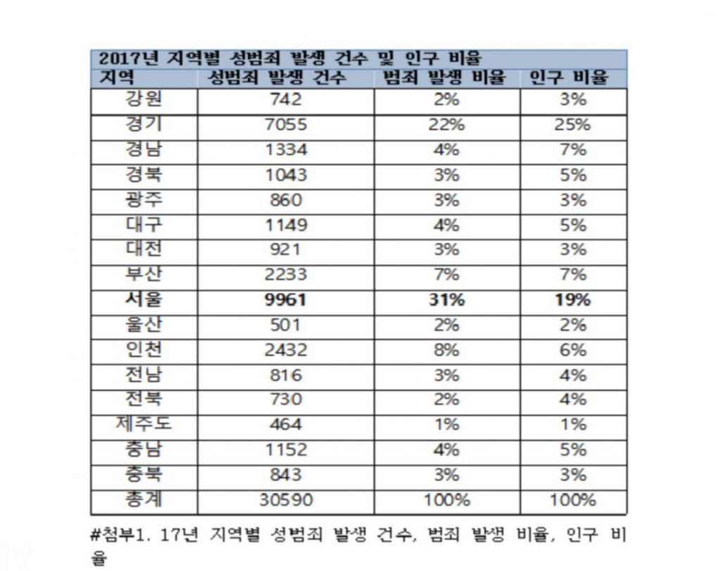 [아시아경제 김봉수 기자]서울이 인구 대비 성범죄율이 매우 높아 5년 연속 전국 17개 시·도 중 1위를 차지한 것으로 나타났다.8일 권미혁 더불어민주당 의원(국회 행정안전위원회)에 따르면, 경찰청에서 제출받은 최근 5년간 성범죄 발생 건수를 확인한 결과, 서울이 5년 연속 성범죄 발생 건수 1위를 차지했다.성범죄 발생 건수는 강간·강제추행, 카메라 등을 이용한 촬영, 통신매체이용음란, 성적목적 공공장소 침입의 전체 발생 건수를 말한다.서울에서 5년간 발생한 성범죄는 2013년도 7,395건, 2014년도 8,523건, 2015년 9,476건, 2016년도 8,342건, 2017년 9,961건으로 5년 연속 전국 1위를 기록했다. 지난해 발생한 전국 성범죄 3만 590건 중 서울에서 발생한 성범죄가 9961건으로 전체의 31%에 해당했다. 서울에 거주하는 인구는 전국 대비 19%로 거주 인구 대비 성범죄율이 높다.서울 다음으로는 경기도에서 성범죄가 많이 발생했다. 2017년도에 7,055건으로 전체 범죄의 22%를 차지했다. 경기도 거주하는 인구 비율은 25%이다.권미혁 의원은 “최근 5년간 성범죄가 계속해서 증가하고 있다. 그 중 30%가 넘는 성범죄가 매년 서울에서 일어나고 있다”라며 “서울지방경찰청은 거주 인구 대비 높은 성범죄 발생 비율에 대해 원인을 분석하고 지역 특성에 맞는 성범죄 예방 치안 정책을 수립해야 한다”고 밝혔다.김봉수 기자 bskim@asiae.co.kr<ⓒ세계를 보는 창 경제를 보는 눈, 아시아경제(www.asiae.co.kr) 무단전재 배포금지>