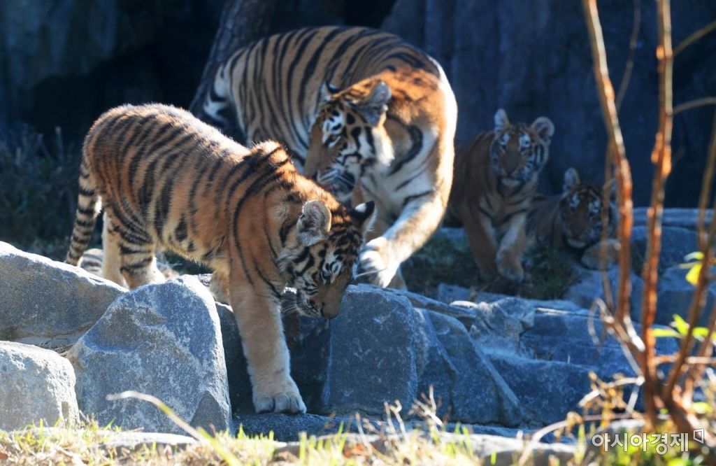 올 5월 서울대공원에서 태어난 아기 시베리아 호랑이 4마리가 12일부터 시민들을 맞이한다. 이날 야외 방사장에서 아기 호랑이들이 어미와 함께 여유로운 시간을 보내고 있다. 백두산 호랑이나 한국 호랑이로도 불리는 시베리아 호랑이는 국제적인 멸종위기 1급 동물로 과거 한반도에 서식했던 호랑이다. /문호남 기자 munonam@<ⓒ세계를 보는 창 경제를 보는 눈, 아시아경제(www.asiae.co.kr) 무단전재 배포금지>