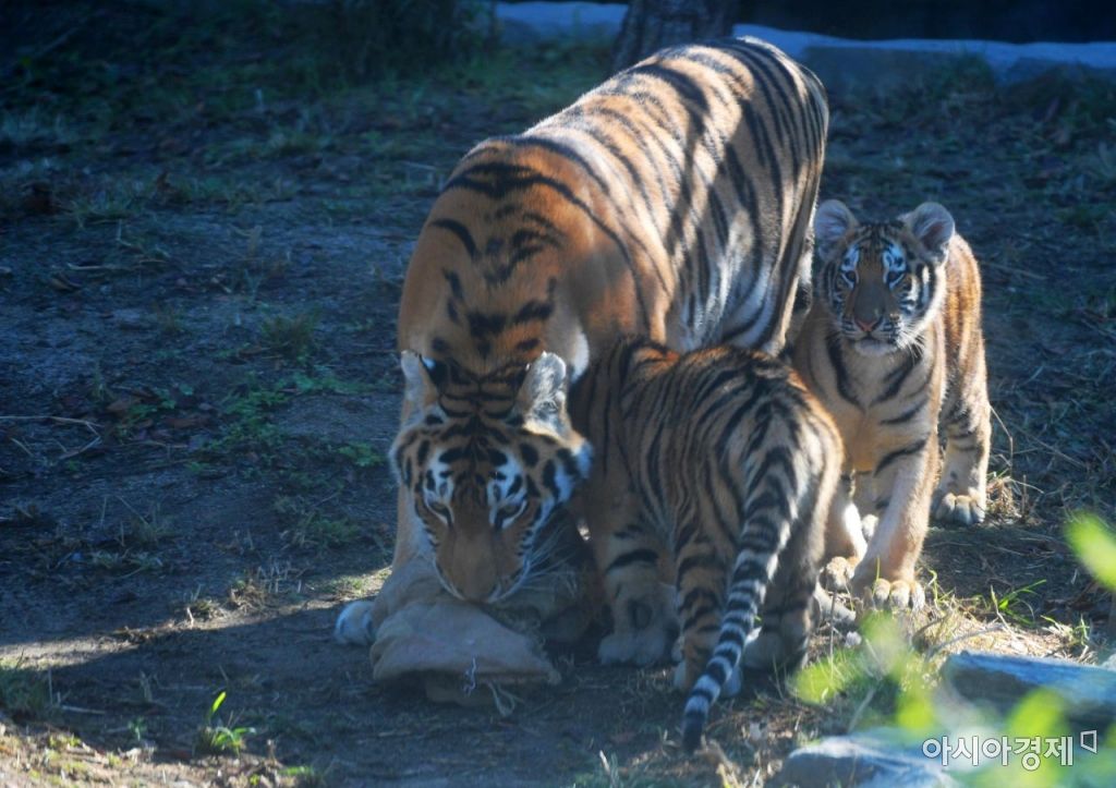 올 5월 서울대공원에서 태어난 아기 시베리아 호랑이 4마리가 12일부터 시민들을 맞이한다. 이날 야외 방사장에서 아기 호랑이들이 어미와 함께 먹이를 먹고 있다. 백두산 호랑이나 한국 호랑이로도 불리는 시베리아 호랑이는 국제적인 멸종위기 1급 동물로 과거 한반도에 서식했던 호랑이다. /문호남 기자 munonam@<ⓒ세계를 보는 창 경제를 보는 눈, 아시아경제(www.asiae.co.kr) 무단전재 배포금지>