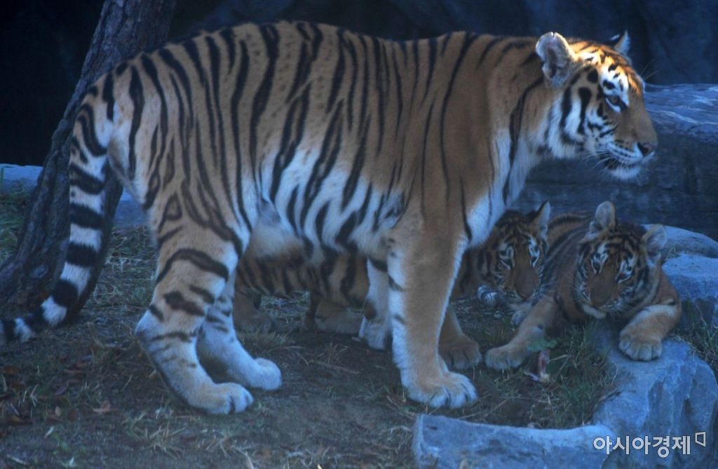 올 5월 서울대공원에서 태어난 아기 시베리아 호랑이 4마리가 12일부터 시민들을 맞이한다. 이날 야외 방사장에서 아기 호랑이들이 어미와 함께 먹이를 먹고 있다. 백두산 호랑이나 한국 호랑이로도 불리는 시베리아 호랑이는 국제적인 멸종위기 1급 동물로 과거 한반도에 서식했던 호랑이다. /문호남 기자 munonam@<ⓒ세계를 보는 창 경제를 보는 눈, 아시아경제(www.asiae.co.kr) 무단전재 배포금지>