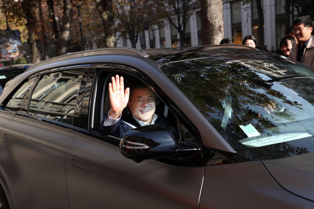 프랑스를 국빈 방문 중인 문재인 대통령이 14일 오후(현지시간) 파리 중심가인 샹젤리제 인근 거리에서 현대자동차가 수출한 '넥쏘' 수소 전기차를 탑승한 뒤 손을 흔들고 있다. 문 대통령이 탄 차량은 현대차가 프랑스에 수출해 통관된 '넥쏘'의 첫 번째 차량이다. <br /> 사진=연합뉴스