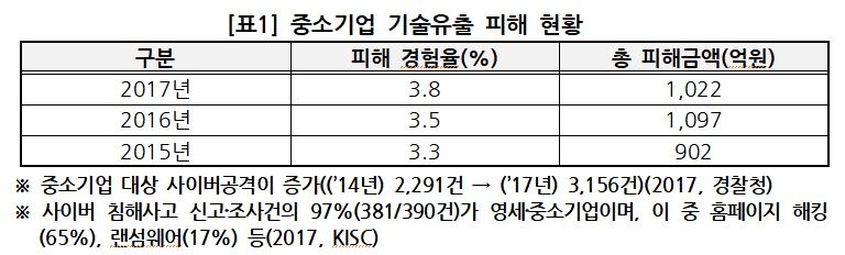 [아시아경제 김동표 기자] 해킹·랜섬웨어 등 사이버 피해를 입은 곳의 97%가 영세·중소기업인 것으로 나타났다. 중소기업 규모와 ICT 역량에 따라 차등화된 지원정책이 필요하다는 지적이 나온다.15일 더불어민주당 김성수 의원이 중소벤처기업부의 '중소기업 기술보호 실태 조사' 등을 분석해본 결과, 중소기업은 해킹의 주요 타겟이자 악성코드 유포·경유지로 이용되는 있었다. 사이버 공격에 취약한 실정이며, 이에 따른 기술유출 금액이 2015년 902억원, 2016년 1097억원, 2017년 1022억원으로 계속 늘어나고 있는 것으로 확인됐다. 최근 3년간 총 피해액만 3021억원에 달한다.