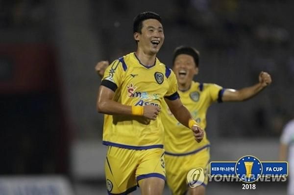 지난 8월8일 충남 아산 이순신종합운동장에서 열린 2018 KEB하나은행 FA컵 16강 아산과 전북의 경기에서 아산 이한샘이 골을 넣은 뒤 기뻐하고 있다.사진=연합뉴스