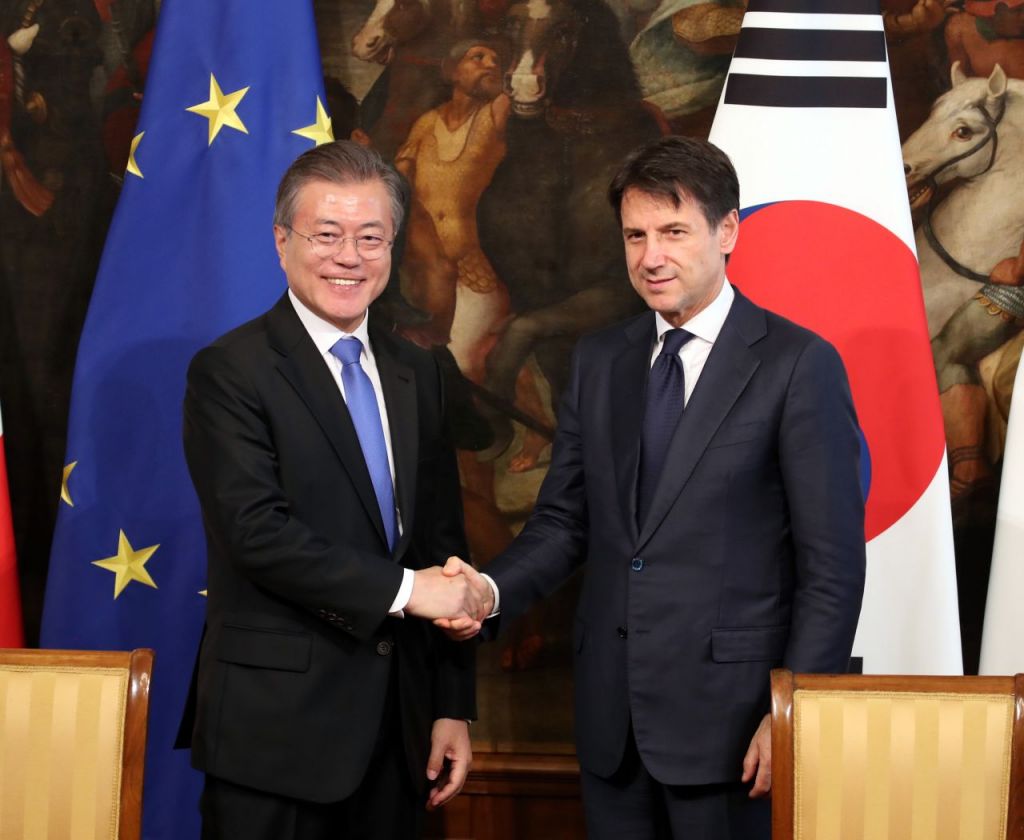 이탈리아를 공식 방문 중인 문재인 대통령이 17일 오후(현지시간) 총리궁인 팔라조 키지에서 열린 정상회담에서 주세페 콘테 총리와 악수하고 있다.<br /> 사진=연합뉴스