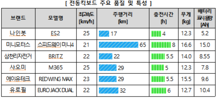 미니모터스가 65㎞로 가장 길고, 나인봇이 17㎞로 가장 짧아전 제품 모두 최고속도, 배터리 등 안전에는 문제 없어