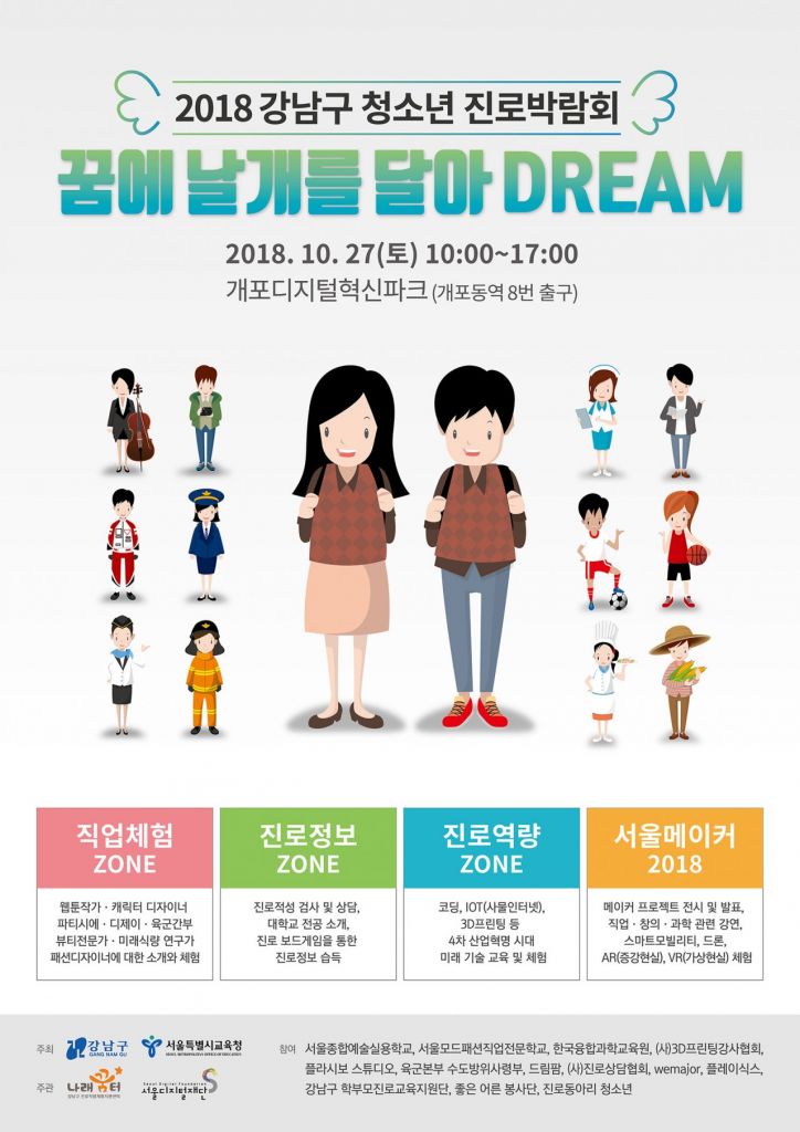 [아시아경제 박종일 기자] 강남구(구청장 정순균)가 27일 오전 10시부터 오후 5시까지 개포디지털혁신파크 울림마당에서 청소년 진로박람회 ‘꿈에 날개를 달아 DREAM’을 개최한다.이 행사는 청소년에게 다양한 진로정보와 직업체험의 기회를 주기 위해 구와 강남구 진로직업체험센터가 2010년부터 공동운영하고 있으며, 올해는 ▲3D프린팅·사물인터넷·코딩 등 4차산업 체험 ▲웹툰작가·캐릭터 디자인·뷰티전문가 등 직업체험 ▲진로적성검사 등 직업상담 등 15개 부스가 마련된다.모든 프로그램은 무료로 진행되며, 현장에서 바로 참여할 수 있다. 자세한 내용은 강남구 진로직업체험지원센터 홈페이지(www.wingdream.co.kr)를 참고하거나 전화(☎550-3627~9)로 문의하면 된다.양미영 교육지원과장은 “청소년들이 미래사회의 건강한 구성원으로 성장할 수 있도록 다양한 직업체험의 기회를 준비하고 있다”며 “청소년들이 ‘기분 좋은 변화’를 주도해 ‘품격 있는 강남’을 만들어주길 바란다”고 말했다.‘꿈에 날개를 달아 DREAM’ 참석자들은 이날 같은 장소에서 서울시와 서울디지털재단이 주최하는 ‘서울메이커2018’을 방문해 드론, AR(증강현실), VR(가상현실) 등을 체험할 수도 있다.박종일 기자 dream@asiae.co.kr<ⓒ세계를 보는 창 경제를 보는 눈, 아시아경제(www.asiae.co.kr) 무단전재 배포금지>
