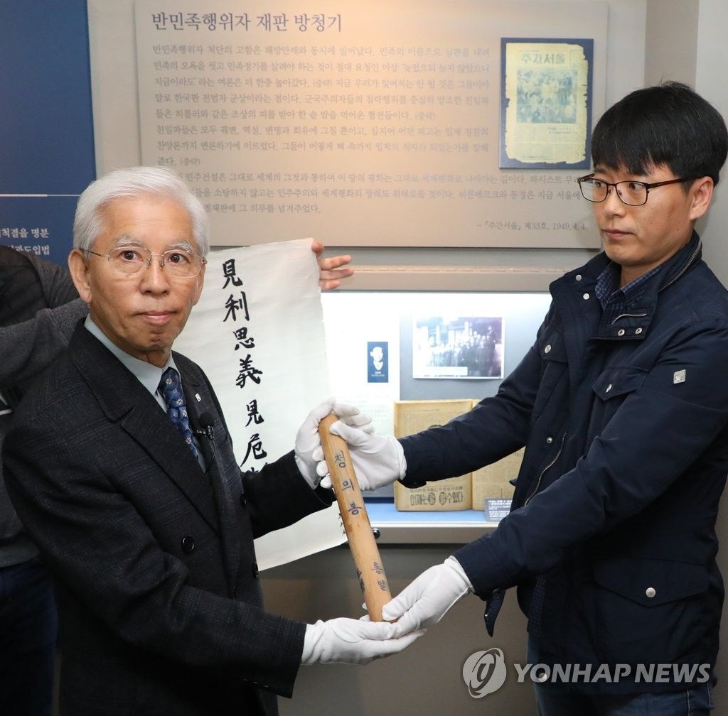 백범 김구 암살범 안두희 전 육군 소위를 살해한 박기서(70) 씨가 24일 용산구 식민지역사박물관에서 당시 안두희를 처단하는 데 사용한 '정의봉'을 기증하고 있다. / 사진=연합뉴스