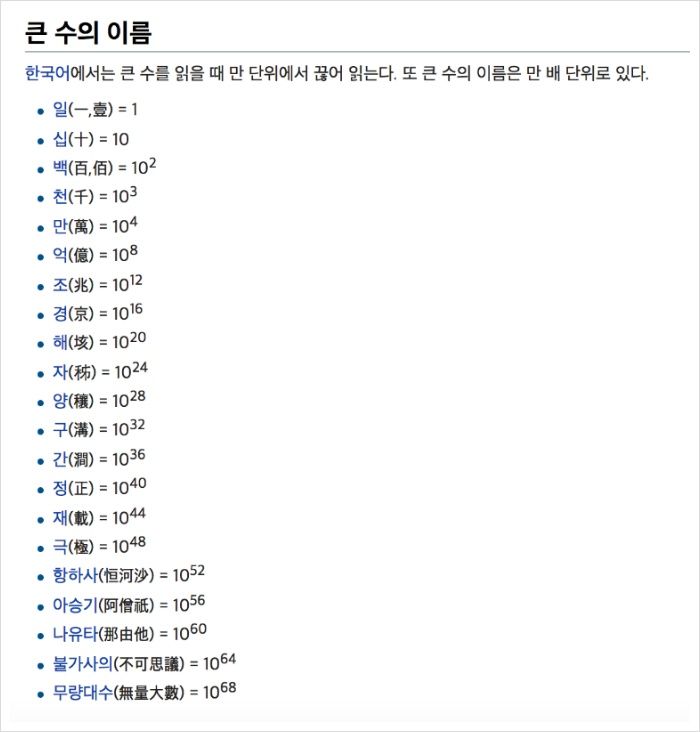 이 가운데 중국의 국유기업 부채가 ‘경’ 단위로 언급되면서 한국의 큰 숫자를 읽는 단위들이 이목을 끌고 있다.한국어에서 큰 수를 읽을 때, 만 단위로 끊어 읽는 것이 일반적이다. 일상적으로 사용하는 일, 십, 백, 천, 만(10⁴) 다음의 단위는 억·조·경·해·자·양·구·간·정·재·극·항하사·아승기·나유타·불가사의·무량대수 순이다.억은 10을 8번 곱한 10의 8제곱을 뜻하며, 조는 10의 12제곱이다. 차례로 10의 4제곱씩을 곱해 계산되며 가장 큰 수의 단위인 무량대수는 10의 68제곱을 뜻한다.특히 ‘불가사의하다’는 형용사의 ‘불가사의’는 사실 10의 64제곱을 일컫는 수의 단위다.온라인이슈팀 issue@asiae.co.kr<ⓒ세계를 보는 창 경제를 보는 눈, 아시아경제(www.asiae.co.kr) 무단전재 배포금지>