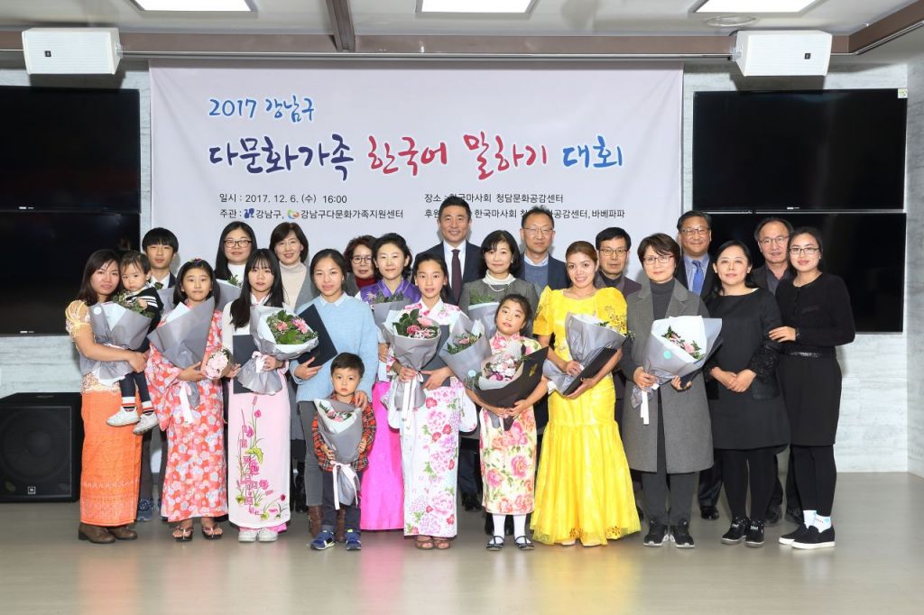 [아시아경제 박종일 기자] 강남구(구청장 정순균)가 11월23일 오후 4시 강남구다문화가족지원센터에서 ‘2018 강남구 다문화가족 한국어 말하기 대회’를 개최한다.한국어 말하기 대회는 ‘다문화가족 한국생활 지원사업’ 일환으로 강남구와 강남구다문화가족지원센터가 공동 주관, 한국마사회 청담문화공감센터가 후원한다.경연은 결혼이민자 대상 ‘한국어 말하기’와 다문화가족자녀 대상 ‘이중언어 말하기’로 2개 부문이다. 참가신청서는 11월9일까지 다문화가족지원센터로 방문, 이메일(34143346@hanmail.net), 우편 제출하면 된다. 자세한 사항은 강남구(www.gangnam.go.kr) 및 강남구다문화가족지원센터(goo.gl/sYL1AD) 홈페이지 공지사항에서 확인할 수 있다.