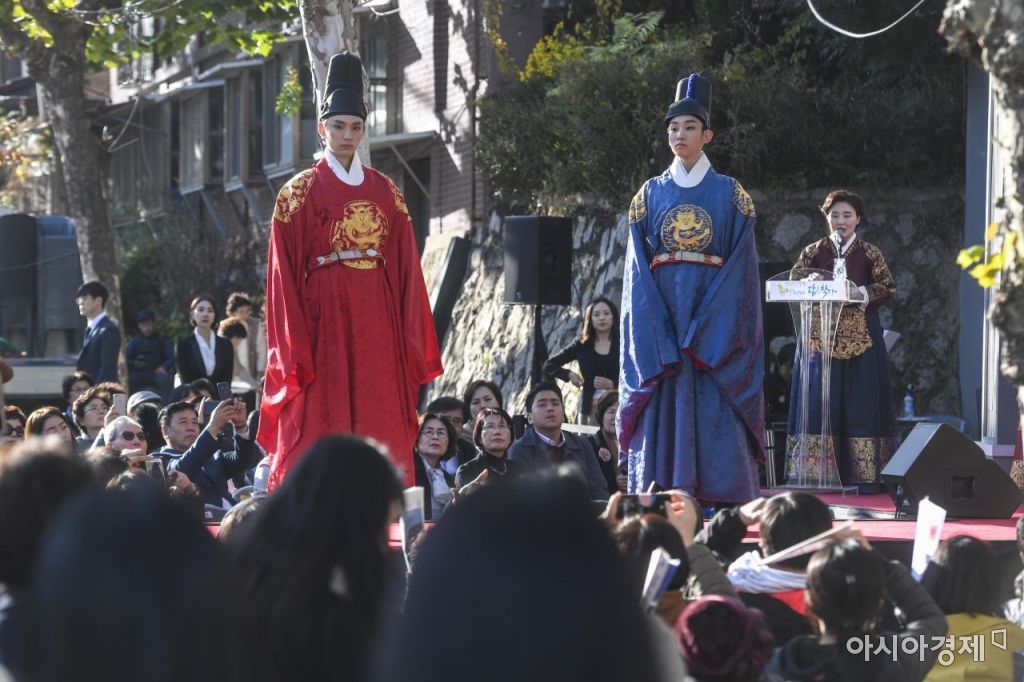 1일 서울 성북선잠박물관 앞에서 열린 '규방에서 피어난 우리 자수전 개막식'에서 조선 왕실의 옷 패션쇼가 진행되고 있다./강진형 기자aymsdream@<ⓒ세계를 보는 창 경제를 보는 눈, 아시아경제(www.asiae.co.kr) 무단전재 배포금지>