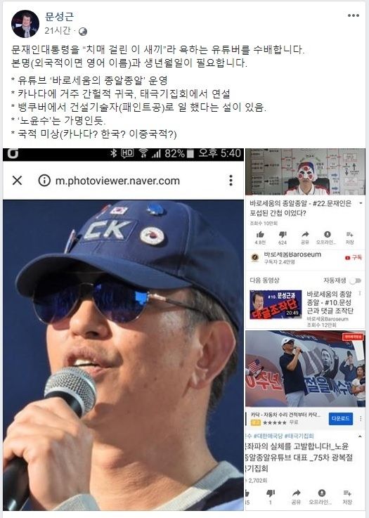 배우 문성근이 문재인 대통령을 모욕한 유튜버를 ‘공개 수배’하겠다고 밝혔다.문성근은 지난달 31일 자신의 페이스북을 통해 “문재인 대통령을 ‘치매 걸린 이 XX’라 욕하는 유튜버를 수배한다”고 전했다.문성근이 찾고 있는 유튜버는 유튜브 계정 ‘바로세움의 종알종알’을 운영 중인 것으로 알려졌다. 그는 “문재인은 조작된 간첩이었다” “문성근은 댓글 알바의 배후” “종북시장 박원순 시민단체 통해 불법 모금” 등을 주장했다.문성근은 해당 유튜버의 본명과 생년월일이 필요하다고 덧붙였다.해당 유튜버는 해외에 거주하나 종종 귀국해 태극기 집회에서 연설해온 것으로 알려졌다.한편 문성근은 민주당 상임고문을 지낸 바 있다. 그러나 지난 2013년 부산시당에 탈당 신고서와 사유를 제출하고 탈당했다.<center><div class="slide_frame"><input type="hidden" id="slideIframeId" value="2017051018363719182A">